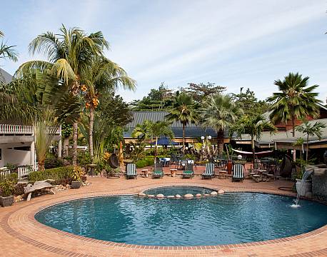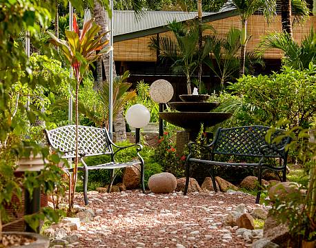 I hotellets grönskande trädgård finns en inbjudande pool, en mysig bar och en restaurang som är känd på ön för sina utsökta rätter och avslappnade atmosfär.
