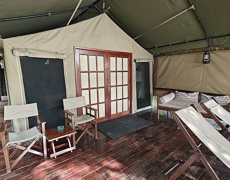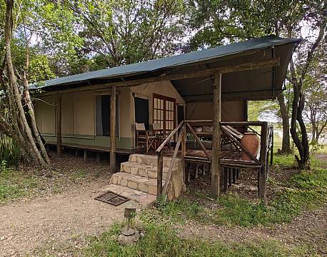 Tälten är byggda på träplattformar med rymliga terrasser där man kan njuta av en eftermiddagssiesta på en bekväm dagbädd medan man tar in de fantastiska omgivningarna. Härifrån kan man se färgstarka fåglar, frodig vegetation, den storslagna Mara-floden och Oloololo-kullarna. Tälten har stora sängar och kan anpassas som dubbel- eller tvåbäddsrum. Efter överenskommelse kan en tredje och till och med en fjärde säng läggas till för barn under 12 år. Familjeenheten består av två tält med en gemensam veranda. Det privata badrummet är utrustat med vattenklosett, dubbla handfat och en romantisk utomhusdusch med fantastisk utsikt mot himlen. Vatten värms upp med solpaneler för att undvika användning av ved och därmed bevara Mara-skogen. Elektricitet är tillgänglig i alla tält dygnet runt via ett utökat solpanels- och batterisystem.