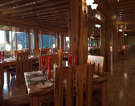 De gemensamma utrymmena är också utformade med fokus på utsikten. Restaurang och bar har direkt vy över kratern och skapar en stämningsfull miljö för måltider och avkoppling. Utsiktsterrassen och loungen är perfekta platser för att uppleva soluppgången, och det välutrustade gymmet ger möjlighet till fysisk aktivitet. Lodgen erbjuder även tvättservice, god tillgänglighet för gäster med nedsatt rörlighet och en trevlig souvenirbutik.