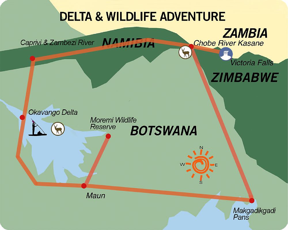 Inlandsstaten Botswana i södra Afrika rymmer bland annat några av Afrikas mest fantastiska och orörda sevärdheter och nationalparker. Botswana erbjuder helt extraordinära djur- och naturupplevelser, och på denna rundresa ingår även ett besök vid det imponerande Victoriafallen i Zimbabwe.På rundresan får ni uppleva ett fantastiskt djurliv vid Chobefloden, som har Afrikas största bestånd av elefanter. Se solen gå ner över den 6 500 km² stora Makgadikgadislätten. Det blir safariturer i öppna fyrhjulsdrivna fordon i Moremi Wildlife Reserve, och ni bor på kanten av det unika Okavangodeltat. Härifrån kan ni ta båtturer på de många kanalerna, bli paddlade genom vattnet i en mokoro eller gå på vandring på de små öarna som skjuter upp i deltat.