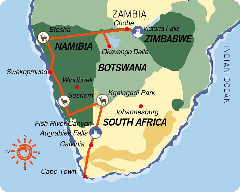 Välkommen till detta fantastiska äventyr med engelsktalande guide från Kapstaden till Victoriafallen eller tvärtom från Victoriafallen till Kapstaden. Under resan besöker du många av de bästa platserna i södra Afrika. Du ger dig ut på en spännande resa genom länder som Namibia och Botswana. Under resan kommer du att uppleva olika befolkningar och kulturer, och självklart en helt fantastisk natur.